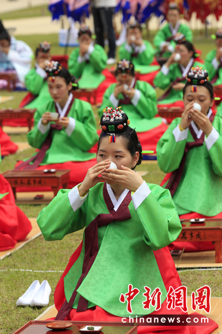 5月17日,韓國首都首爾慶熙宮舉行了第38屆成人禮儀式。為了慶祝青年人年滿20歲,同時(shí)也為了提高他們身為成人的責(zé)任感。圖為韓國少女在成人儀式上喝酒。圖片來源:中國新聞網(wǎng)
