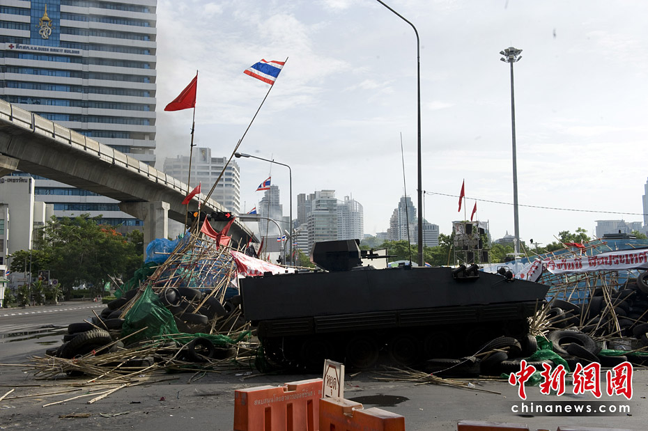 19日泰國軍方對聚集在首都曼谷市示威的反政府“紅衫軍”展開了驅(qū)散行動。軍方裝甲車已突破“紅衫軍”所筑路障,且至少有3人被槍擊中。圖片來源:中國新聞網(wǎng)