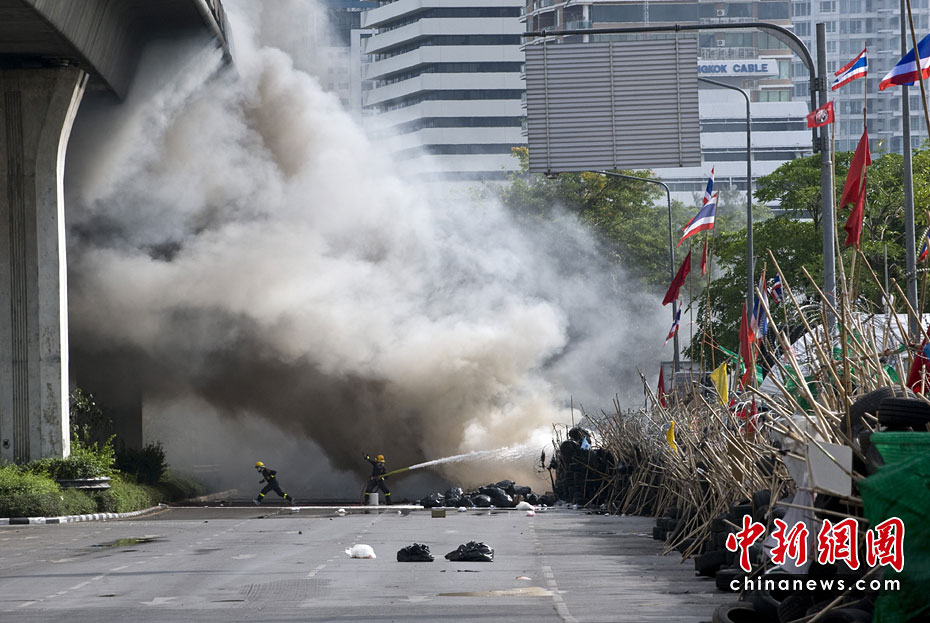 19日泰國(guó)軍方對(duì)聚集在首都曼谷市示威的反政府“紅衫軍”展開了驅(qū)散行動(dòng)。軍方裝甲車已突破“紅衫軍”所筑路障,且至少有3人被槍擊中。圖片來(lái)源:中國(guó)新聞網(wǎng)