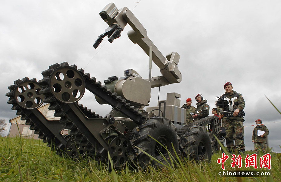 當(dāng)?shù)貢r間5月18日,德國南部哈默爾堡舉行了歐洲軍用機(jī)器人大賽。歐洲各國軍用機(jī)器人在大賽上一展身手。圖片來源:中國新聞網(wǎng)