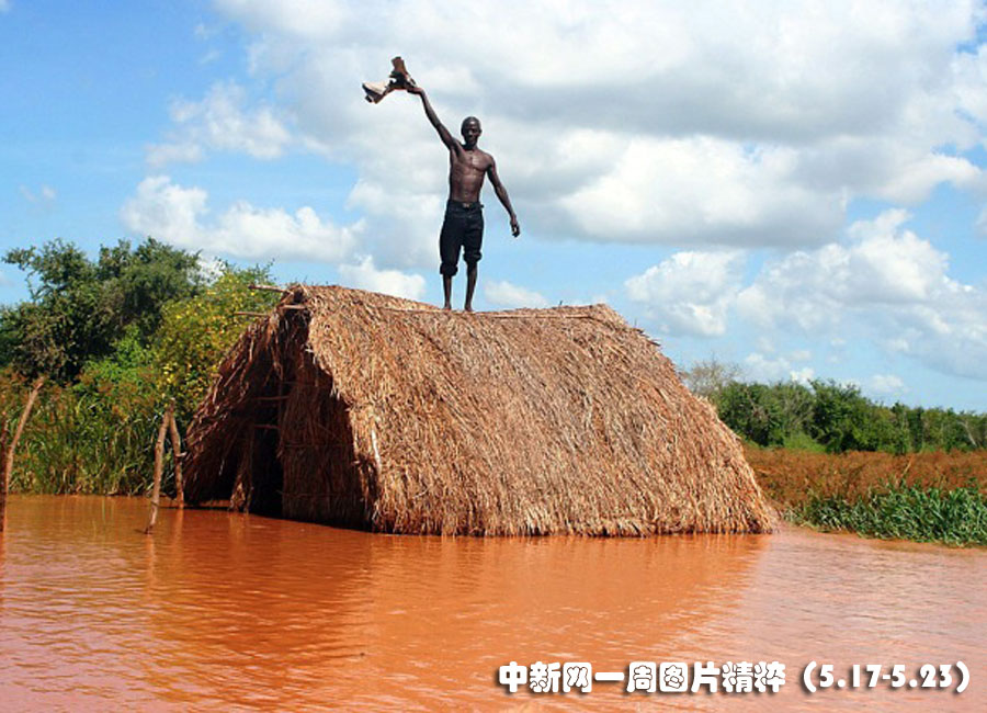 5月20日肯尼亞一名村民的茅草房被水淹沒,他站在房頂尋求幫助。一個電廠開閘放水導(dǎo)致塔納河決堤,造成100多人無家可歸。