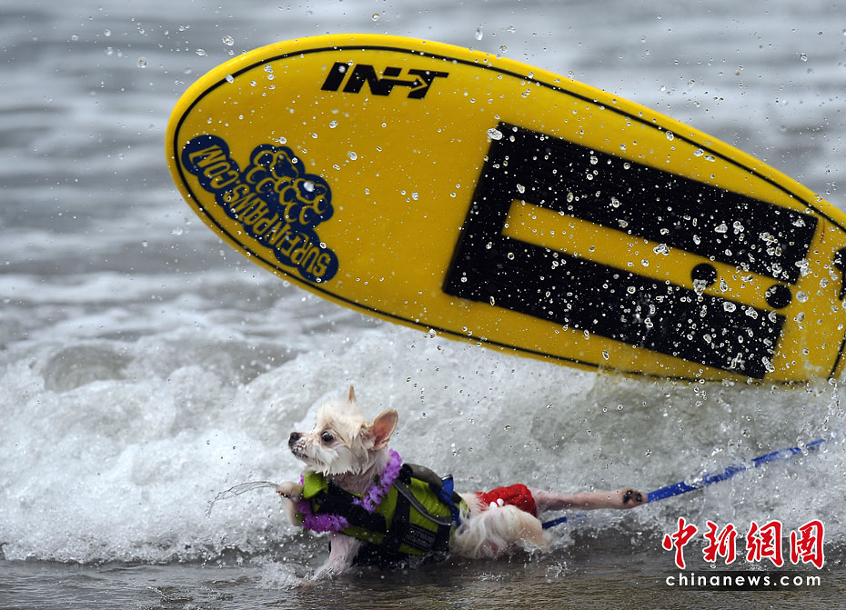 5月22日,美國加利福尼亞州圣迭戈舉行了一場妙趣橫生的狗狗沖浪比賽。圖片來源:中國新聞網(wǎng)
