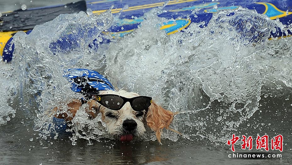 5月22日,美國加利福尼亞州圣迭戈舉行了一場妙趣橫生的狗狗沖浪比賽。圖片來源:中國新聞網(wǎng)