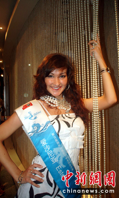 5月24日,海南三亞,正在此間參加第35屆國際比基尼小姐全球總決賽的64位佳麗,參觀了三亞一家珍珠博物館。佳麗們對漂亮的珍珠十分鐘愛,在攝影師前擺出各種“POSE”,留下美麗身影。 中新社記者 尹海明攝