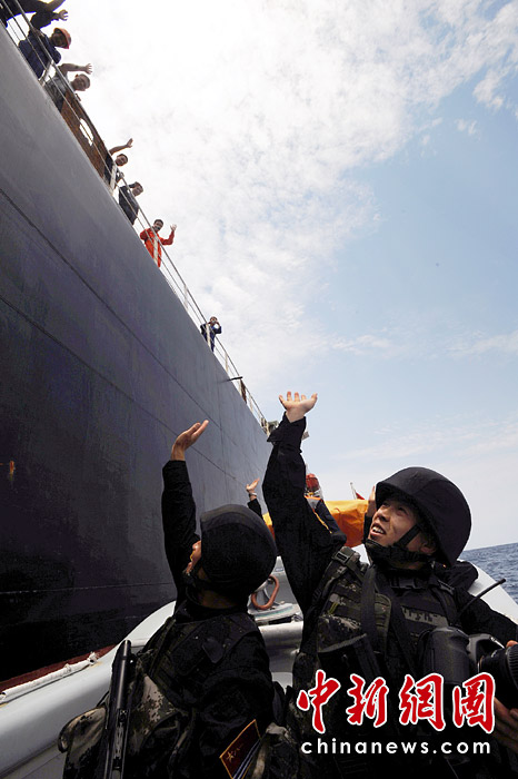 4月16日當(dāng)?shù)貢r(shí)間11時(shí),第五批護(hù)航編隊(duì)圓滿完成第188批護(hù)航任務(wù),在“嘉永山”輪船實(shí)施隨船護(hù)衛(wèi)的4名特戰(zhàn)隊(duì)員換乘小艇離開(kāi)時(shí),船員紛紛來(lái)到甲板與他們揮手告別。江山 攝