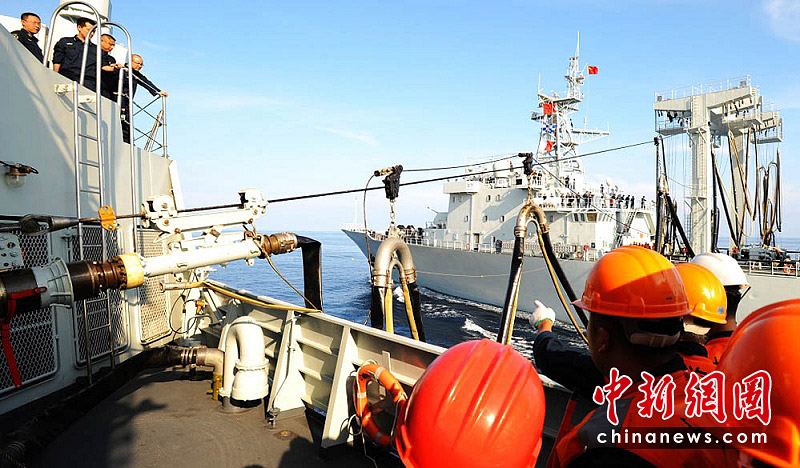 3月9日上午,第五批護航編隊在印度洋進行了首次海上補給!拔⑸胶本C合補給艦對“廣州”號導彈驅(qū)逐艦進行了橫向的液貨補給。江山 攝