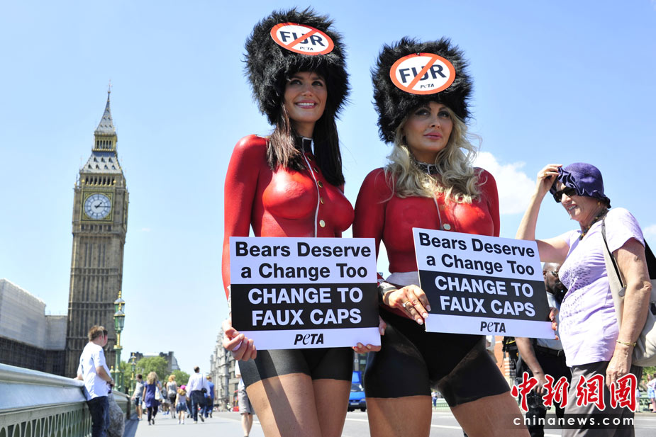 5月24日,倫敦,兩位打扮成英國(guó)女王守衛(wèi)模樣的靚模在威斯敏斯特大橋上抗議女王守衛(wèi)頭戴熊皮制作的帽子,倡議保護(hù)動(dòng)物。