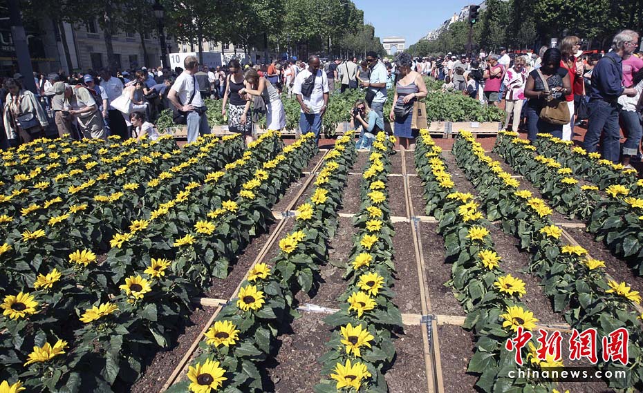 5月24日,法國總統(tǒng)薩科齊和妻子布呂尼參觀在法國巴黎舉行的“自然首都”展。該項展覽是由街頭藝術(shù)家加德·魏爾聯(lián)手法國“青年農(nóng)民協(xié)會”和林業(yè)協(xié)會共同發(fā)起的的,將百余種農(nóng)作物、樹木和動物“齊聚”法國首都巴黎的香榭麗舍大街,令這條“香街”變身“綠色的自然世界”。圖片來源:中國新聞網(wǎng)