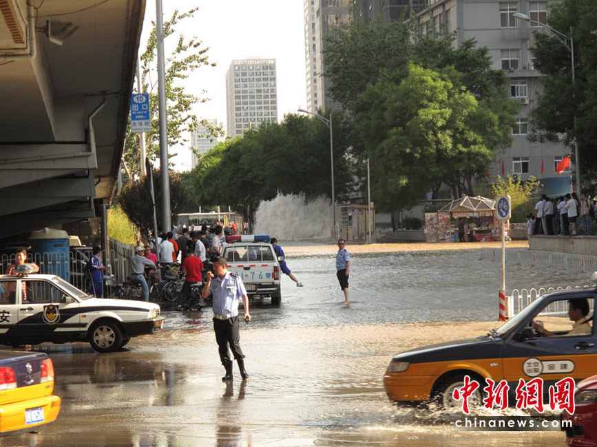 2010年5月25日下午4點半左右,北京京廣橋附近發(fā)生水管爆裂,水柱噴射到兩層樓高,流出的水已成河,造成東三環(huán)嚴重擁堵。沈軍 攝