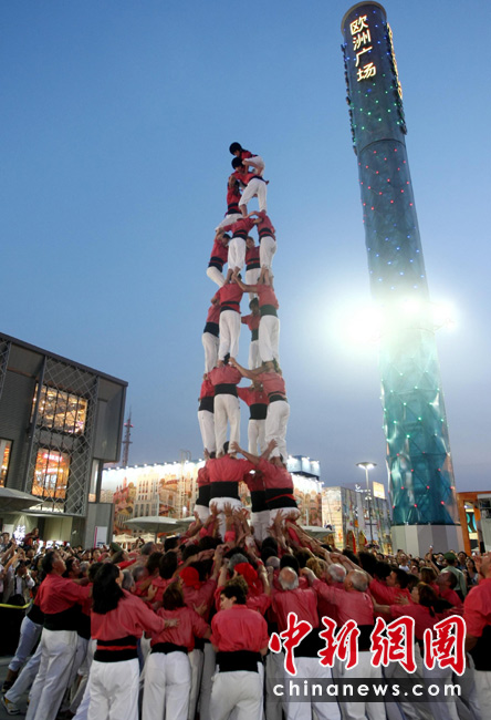 5月25日,西班牙“人塔”在上海世博會(huì)歐洲廣場上逐層壘起,為西班牙加泰羅尼亞周助興!隘B人塔”(HUMAN WALL),是西班牙加泰羅尼亞地區(qū)最具傳統(tǒng)特色的民俗節(jié)慶活動(dòng),起源于18世紀(jì)末加泰羅尼亞南部的巴爾斯。后來,“疊人塔”活動(dòng)逐漸在加泰羅尼亞其他地區(qū)流行,進(jìn)而風(fēng)靡整個(gè)西班牙。中新社發(fā) 杜洋 攝