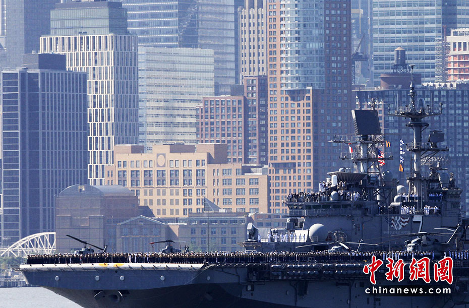 當(dāng)?shù)貢r(shí)間5月26日,美國(guó)第23屆紐約艦隊(duì)周開(kāi)幕,包括“硫磺島”號(hào)兩棲攻擊艦在內(nèi)的11艘參加艦隊(duì)周活動(dòng)的軍艦由南向北在哈得孫河面上游弋。紐約民眾將以?吭诼D哈得孫河86號(hào)碼頭的“無(wú)畏號(hào)”航母博物館為中心,展開(kāi)為期一周的慶祝和紀(jì)念活動(dòng)。圖片來(lái)源:中國(guó)新聞網(wǎng)