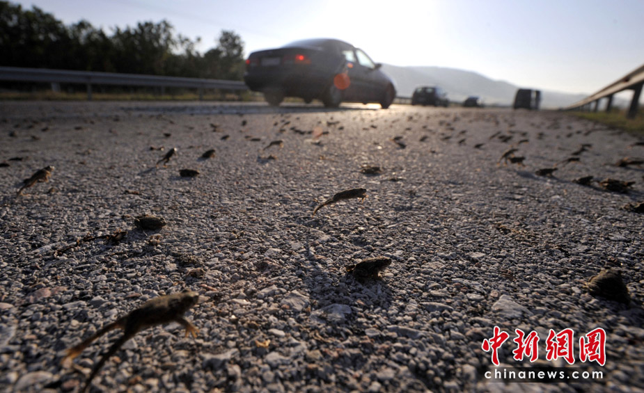 26日,希臘東北部地區(qū)的一條高速公路遭數(shù)百萬(wàn)只青蛙“占據(jù)”而被迫關(guān)閉了兩個(gè)小時(shí)。希臘環(huán)保部門表示,這些青蛙可能只是在前往附近小湖找食物過(guò)程中“碰巧路過(guò)”高速公路。