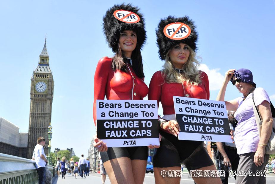 5月24日,倫敦,兩位打扮成英國(guó)女王守衛(wèi)模樣的靚模在威斯敏斯特大橋上抗議女王守衛(wèi)頭戴熊皮制作的帽子,倡議保護(hù)動(dòng)物。圖片來(lái)源:中國(guó)新聞網(wǎng)>>點(diǎn)擊觀看詳細(xì)內(nèi)容
