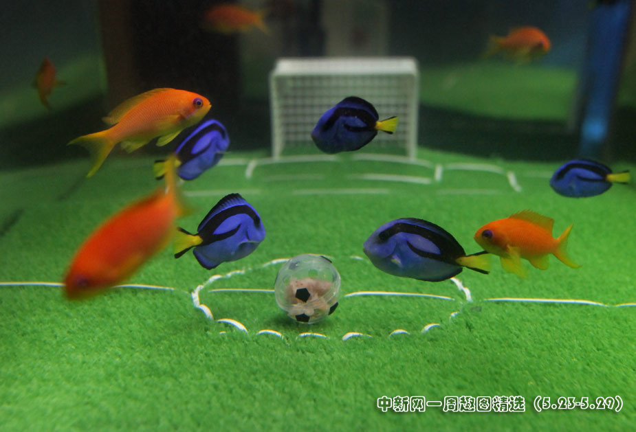 5月23日,日本橫濱八景島海洋世界水族館中,一群魚兒在“踢足球”,藍(lán)色魚代表日本隊(duì),橘色魚代表荷蘭隊(duì)。在2010年南非“世界杯”上,日本將迎戰(zhàn)荷蘭隊(duì)。 圖片來源:中國(guó)新聞網(wǎng)>>點(diǎn)擊觀看詳細(xì)內(nèi)容