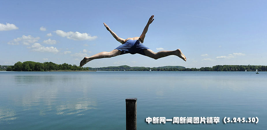 24日(周一),德國(guó)南部天氣炎熱,一名男子在河邊跳水。