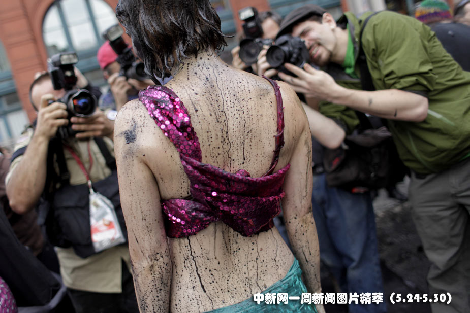 28日(周五),美國(guó)環(huán)保主義者在紐約曼哈頓的一家加油站前,身上涂灑黑色顏料,以此抗議墨西哥灣原油不斷泄露。