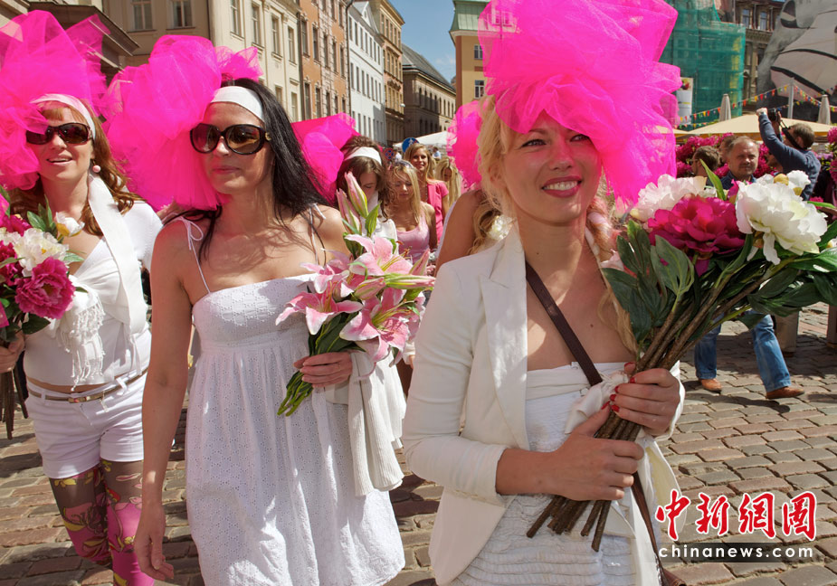 5月29日,在拉脫維亞首都里加,眾多金發(fā)美女身著艷麗裝扮在街頭游行,大秀嫵媚身材。