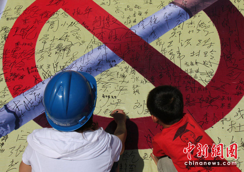 5月31日是第23個(gè)“世界無(wú)煙日”,今年的主題是:性別與煙草——抵制針對(duì)女性的市場(chǎng)營(yíng)銷。吸煙有害健康早已成為不爭(zhēng)的事實(shí)。有關(guān)醫(yī)學(xué)研究表明,吸煙可導(dǎo)致心腦血管疾病、癌癥、慢性阻塞性肺病等多種疾病,已成為繼高血壓之后的全球第二號(hào)殺手。為了您的健康,請(qǐng)熄滅您手中的香煙。圖為5月30日,河南省湯陰縣一名女電力工人和孩子一起在禁止吸煙標(biāo)志上簽名,表示要遠(yuǎn)離香煙,自覺(jué)加入控?zé)熽?duì)伍。常中正 攝