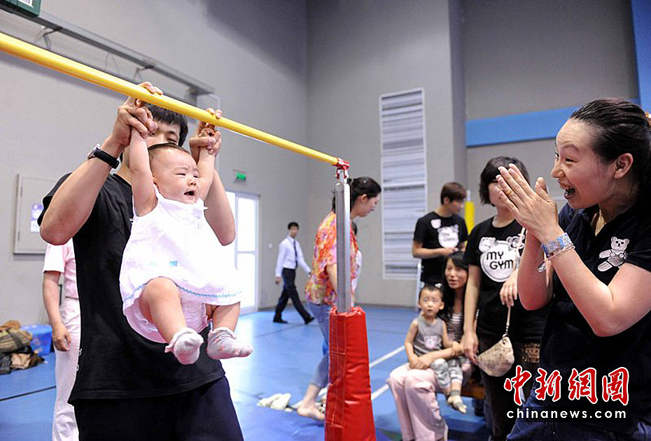 5月29日上午,北京,300多個(gè)六歲以下的寶寶在樂成國(guó)際學(xué)校參加六一歡動(dòng)會(huì)活動(dòng)。圖為寶寶在老師的輔助下完成超級(jí)單杠。歐陽(yáng)曉菲/CFP