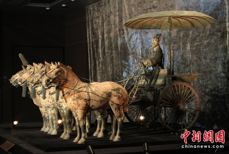 6月1日,秦始皇帝陵出土的“一號銅車馬”亮相世博會中國國家館,這是它出土30年以來第一次“駛出”陜西。這件國寶級文物在地下歷經(jīng)了2200多個春秋,于1980年出土,通體彩繪,為雙輪,單轅,駟馬系駕,總重約1061公斤。銅車馬共由3500多個零件組成,除一些金、銀飾件外,其余全部為青銅鑄件。中新社記者 殷春永 攝