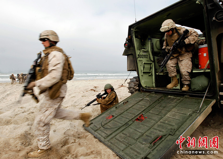 當(dāng)?shù)貢r(shí)間6月4日,約5000名水兵和陸戰(zhàn)隊(duì)員在美國(guó)加利福尼亞州舉行了代號(hào)為“黎明突擊”的搶灘登陸軍事演習(xí)。圖片來(lái)源:中國(guó)新聞網(wǎng)