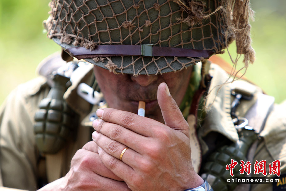 6月5日,諾曼底登陸66周年前夕,一批演員身著二戰(zhàn)時期美軍軍服,在法國諾曼底卡倫坦重現(xiàn)了這次著名的戰(zhàn)役。