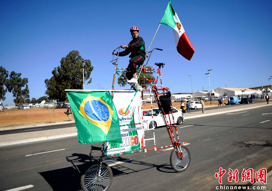 當(dāng)?shù)貢r間6月9日,南非約翰內(nèi)斯堡足球城,一名球迷騎行特型自行車。中新社發(fā) 廖攀 攝