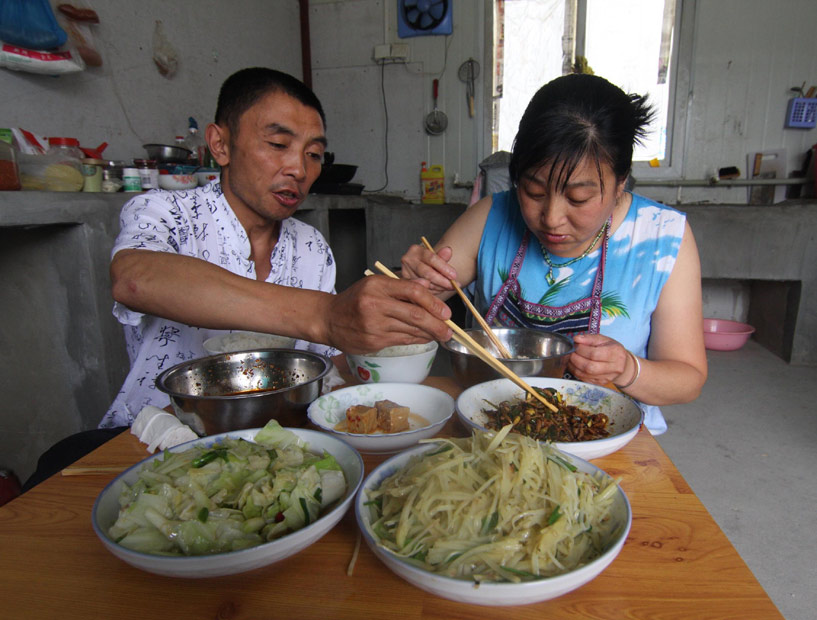 5月4日,北川縣曲山鎮(zhèn)永興板房里的重組夫妻尹華均和妻子朱云翠一起吃飯。在“512”地震中失去親人的他,重獲美滿的家庭。 尹華均在曲山鎮(zhèn)回龍社區(qū)擔任組長,在地震中失去了妻子的他幸運的遇見了同在地震中失去親人的朱云翠,并締結良緣。中新社發(fā) 郭國權 攝