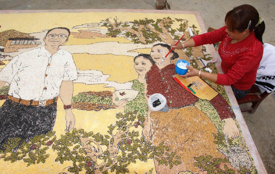 溫家寶總理兩度探望的四川大地震極重災(zāi)區(qū)青川縣黃坪鄉(xiāng),村民正用五谷雜糧制作大型粘貼畫:“總理來到棗樹村”,藝術(shù)性再現(xiàn)他親臨棗樹村關(guān)心慰問鄉(xiāng)民的情景。該畫高1.83米,寬3.05米,以木板為底,畫面色彩全部用當(dāng)?shù)厥a(chǎn)的玉米、黃豆、小豆、黑豆、蕎麥等二十多種雜糧拼貼,表達(dá)了村民與國(guó)家領(lǐng)導(dǎo)人的真摯樸實(shí)感情。中新社發(fā) 沈若飛 攝