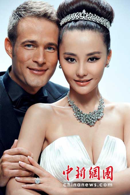 在婚紗照中,馬雅舒身著昂貴的婚紗再次秀起了“鴿子蛋”鉆戒,幸福的感覺(jué)溢于言表,而她的洋老公也得以“廬山現(xiàn)真人”。