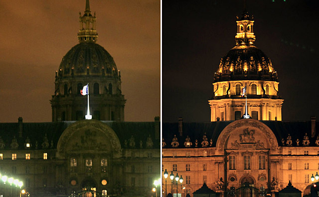 法國巴黎。3月28日,法國巴黎榮軍院熄燈后和亮燈后的照片。