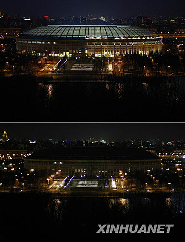 俄羅斯莫斯科:3月28日20時30分后,1980年莫斯科奧運會主體育場盧日尼基體育場熄燈前和熄燈后的對比情況。魯金博 攝(圖片來源:新華網(wǎng))