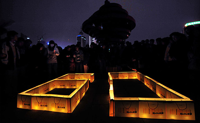 中國青島:3月28日,市民在青島五四廣場上擺出一小時(shí)“60”分鐘的造型參加“地球一小時(shí)”活動(dòng)。
