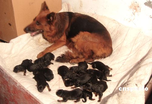 浙江臺州雅特銅業(yè)有限公司的一只護廠狼狗,12月15日中午12點左右,開始產(chǎn)崽,傍晚5點半產(chǎn)下第6只,直到第二天凌晨共產(chǎn)下14只狗崽。據(jù)獸醫(yī)介紹,一般情況下,狗一窩可產(chǎn)3只狗崽左右,一窩產(chǎn)5只的被稱作“五更狗”,一窩產(chǎn)10只狗崽的已不常見,而產(chǎn)下14只就更為稀奇。中新社發(fā) 吳達夫 攝