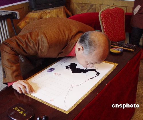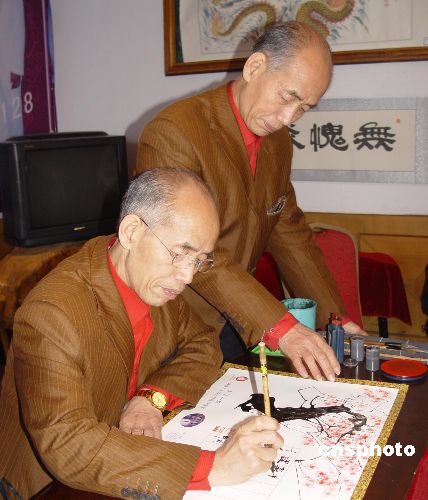 十二月二十一日,精通六十三項技藝的李偉、李雄孿生兄弟,向記者展示包括口吹畫、鋸琴在內(nèi)的絕技。本月中旬,深圳雙胞胎兄弟李雄、李偉應(yīng)邀來河南鄭州創(chuàng)業(yè),兩兄弟現(xiàn)年六十四歲,他倆能畫油畫、版畫、國畫、水粉畫,還能在三十秒內(nèi)吹出一株婀娜多姿的紅梅樹;還能以任意題材逆向題詩一首,其速度之快、繪制之精妙令人嘆為觀止。他們曾應(yīng)邀出訪新加坡、澳大利亞、香港等國家和地區(qū),并擔(dān)任“全球華僑華人推動中國和平統(tǒng)一大會”副秘書長出訪莫斯科。圖為兩兄弟現(xiàn)場合作表演絕技口吹畫及逆向題詩。中新社發(fā) 朱曉娟 攝