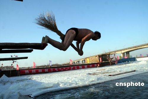 1月15日下午在哈爾濱公路大橋冬泳浴場(chǎng),國(guó)內(nèi)外游客激情觀看冬泳。冬泳愛(ài)好者用各種姿勢(shì)做跳水表演,引來(lái)游客的歡呼聲,冬泳運(yùn)動(dòng)員不怕今天零下20多度的嚴(yán)寒,為讓游客滿意就是再冷也要多游兩次,好讓游客高興而來(lái)盡興而走。中新社發(fā) 姚庭山 攝