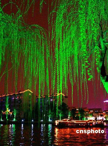 3月17日晚,蘇州環(huán)城河邊楊柳與建筑物在景觀燈的映照下格外迷人。陽春三月,當夜幕降臨后的蘇州環(huán)城湖畔,排列成行的絲絲垂柳在景觀照明燈下,霓裳艷影,水上游船、古橋和兩岸建筑物相映成輝,璀璨奪目,景色迷人。中新社發(fā) 蘇秀 攝