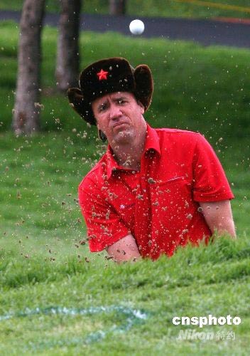 5月11日,北京因雨氣溫突降,很多參加2008華彬北京高爾夫公開賽的運動員都穿上了長衣避寒,一名外國運動員更是戴上了極具中國特色的“紅五星棉軍帽”參加比賽。中新社發(fā) 富田 攝