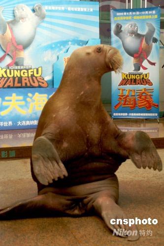 6月22日,大連圣亞海洋世界的一頭名為葛拉薩的功夫奇才海象,正在表演“鐵沙掌”。當(dāng)日是電影《功夫熊貓》在大連首映,這位特殊的“中國熱血功夫迷”——圣亞海象,在現(xiàn)場(chǎng)擺起中國功夫陣,PK剛剛上映的《功夫熊貓》。由于海象的到來,現(xiàn)場(chǎng)被圍得水泄不通。中新社發(fā) 宋太盛 攝