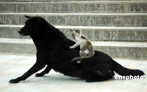 11月16日,一只小貓趴在黑狗的背上。安徽巢湖市居巢區(qū)散兵鎮(zhèn)凌山村一農(nóng)戶家里養(yǎng)著一只花貓和兩條狗。據(jù)主人介紹,小花貓因還在喝奶的時(shí)候,貓媽媽就病死了,營養(yǎng)不良,所以已經(jīng)一歲多的小花貓長(zhǎng)得很瘦弱,兩條狗卻像貓媽媽那樣愛護(hù)著它,小花貓有時(shí)很頑皮,騎在狗背上玩耍,構(gòu)成一幅貓狗一家親令人感動(dòng)的圖畫。中新社發(fā) 徐振華 攝