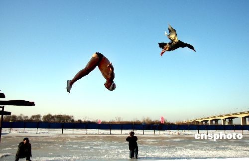 12月10日,在松花江上,黑龍江省冬泳協(xié)會新開設(shè)的冬泳池內(nèi),游客正在觀看人鴨共舞的跳水表演。游人掌聲不斷。據(jù)悉,今年入冬以來鴨子天天在冬泳池內(nèi)戲水游泳,冬泳人讓鴨子跳水是為了鍛煉它的飛行能力,也希望能成為冬泳的又一新看點(diǎn)。中新社發(fā) 姚庭山 攝