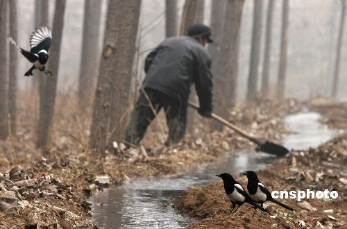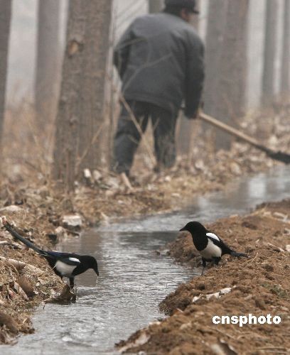 2月6日,河南洛陽(yáng)嵩田湖鎮(zhèn)農(nóng)民引來(lái)嵩伊渠水流灌溉干旱的油菜地,一些喜鵲也趁機(jī)追逐水流,嬉戲解渴。中新社發(fā) 張曉理 攝