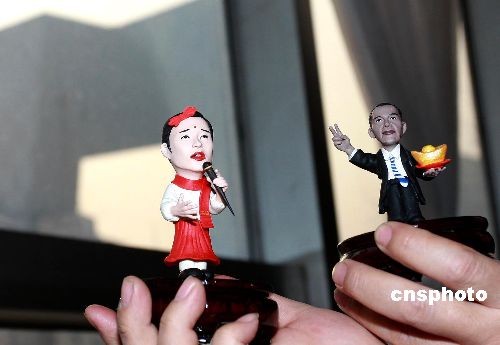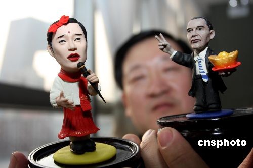 2月8日,北京朝陽區(qū)文化館,非物質(zhì)文化遺產(chǎn)項目傳承人“面人彭”彭小平,展示他精心制作的面人新作品——小沈陽和奧巴馬。當(dāng)日,為迎接正月十五元宵節(jié),朝陽區(qū)文化館舉辦非物質(zhì)文化遺產(chǎn)手工藝作品交流活動,10余位民間藝術(shù)家進行現(xiàn)場技藝展示。中新社發(fā) 鄭雄增 攝
