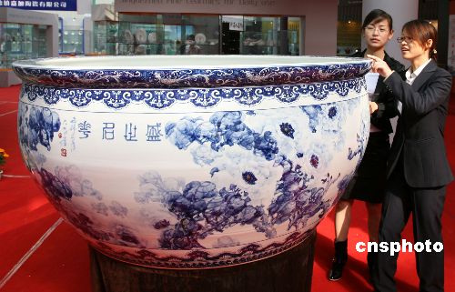 10月18日,2007景德鎮(zhèn)國際陶瓷博覽會開幕。圖為一款名為“盛世名花”的青花釉巨型瓷缸引起觀眾的好奇。這口大缸由景德鎮(zhèn)技師余鵬飛手工拉坯、畫家崔廷玉繪制、經(jīng)1300攝氏度高溫?zé)贫,缸口直?.66米,高0.82米,這是當(dāng)今世界已知最大的一個青花釉瓷缸。中新社發(fā) 吳慶才 攝