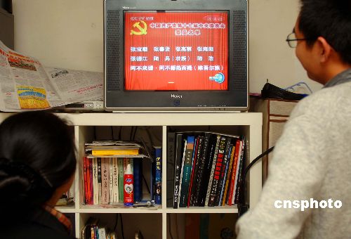 十月二十一日,北京一家住戶中家庭成員關注中央電視臺新聞聯(lián)播節(jié)目正在播送的新一屆中共中央委員會委員名單。當日,中國共產(chǎn)黨第十七次全國代表大會在北京人民大會堂閉幕,新一屆中央委員會和中央紀律檢查委員會經(jīng)選舉產(chǎn)生。中新社發(fā) 廖攀 攝