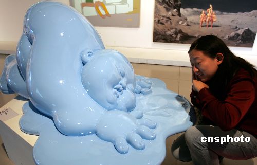 正在上海舉行的動(dòng)漫美學(xué)雙年展有許多作品趣味逗人,一名觀眾在《睡著了》作品旁做模仿?tīng)。?jù)悉,參展的近百件作品來(lái)自意大利、美國(guó)、中國(guó)大陸和臺(tái)灣地區(qū)。中新社發(fā) 潘索菲 攝