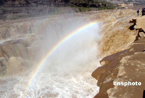 金秋十月,由于上游雨季影響水量倍增,長長的瀑布群沿黃河岸邊綿延一千多米,其中新增加的兩組大型瀑布寬度達(dá)到一百多米,頗為壯觀,加上艷陽高照,壺口瀑布出現(xiàn)美麗的彩虹,讓游客流連忘返。中新社發(fā) 閆銳鵬 攝