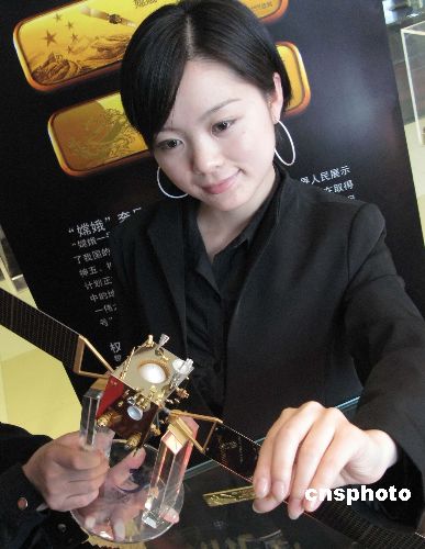 “嫦娥一號”成功發(fā)射揭開了中國探月工程的序幕。為紀念這一成就,10月25日,“中國國家博物館藝術(shù)品開發(fā)中心監(jiān)制的“嫦娥一號”紀念金條在北京由國道黃金公司宣告發(fā)行。“嫦娥一號”紀念金條一套兩根,各為25克AU9999黃金,計限量發(fā)行2007套。第一根金條精雕象征中國萬里長城、五星紅旗和“嫦娥一號”在太空飛行的姿態(tài);第二根金條雕刻有嫦娥奔月的傳統(tǒng)神話圖案,寓意國人千年的夢想開始變成現(xiàn)實。金條背面雕刻的是“嫦娥”一號在太空的運行圖。該紀念金條經(jīng)專業(yè)黃金工藝大師構(gòu)思設(shè)計完成。圖為公關(guān)員持金條在鍍金的“嫦娥一號”配送禮品前亮相。中新社發(fā) 鄒憲 攝