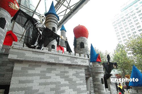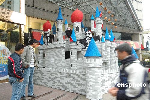 10月30日,兩座“鬼堡”出現(xiàn)在杭州一商店廣場(chǎng)。隨著“萬(wàn)圣節(jié)”到來(lái),杭州部分商家用各種形式的“鬼節(jié)”造型吸引顧客,抓住商機(jī)賺錢。中新社發(fā) 引煒 攝