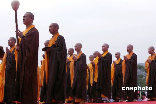 10月30日,中國(guó)(莆田)南北少林武術(shù)公演盛會(huì)在莆田南少林寺隆重舉行,圖為福建佛學(xué)院學(xué)生梵唱團(tuán)108位法師表演《和平梵頌》。中新社發(fā) 張勤 攝